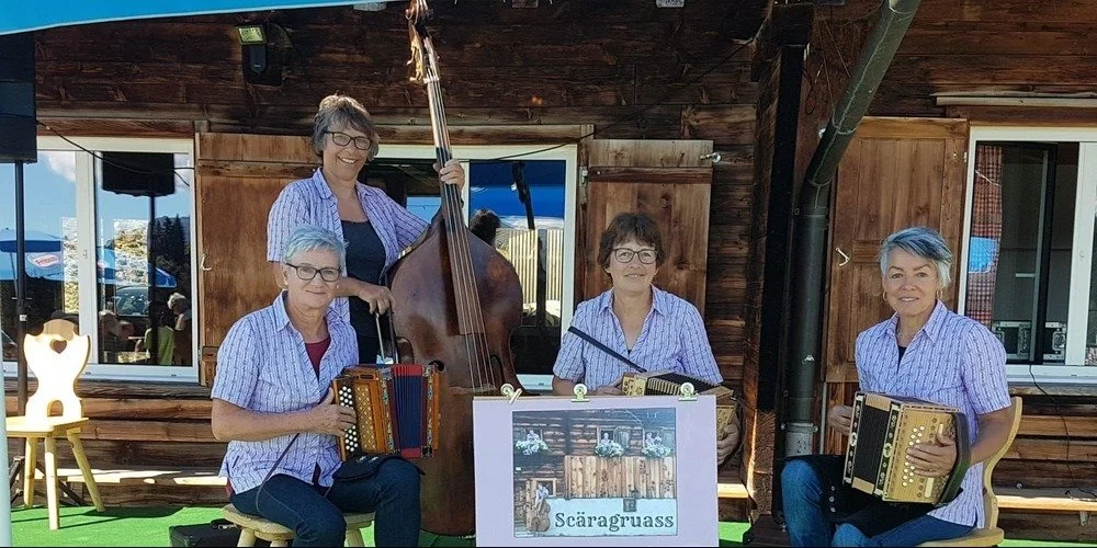 Scäragruass ist eine volkstümliche Formation aus Furna. Vreni Kuratli, auch Örgelilehrerin, bringt mit ihrem Schwyzerörgeli-Quartett mitreissende Unterhaltung ans Brüel-Fescht. Sommersonne, gute Leute und Musik, die Heimatgefühle weckt. Was will man mehr?